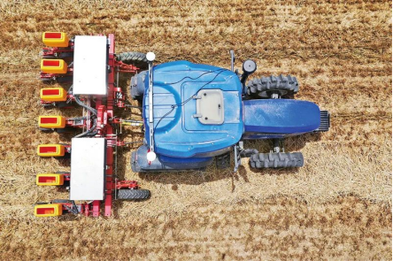 2020年5月26日,在河南省鄧州市小楊營鎮(zhèn)安眾村,加裝有北斗導航系統(tǒng)的拖拉機在無人駕駛狀態(tài)下播種。新華社記者馮大鵬/攝