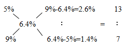 即濃度為5%的糖水和濃度為9%的糖水用量之比為13∶7,同時(shí)根據(jù)混合前濃度為5%的糖水質(zhì)量為130克便可求出濃度為9%的糖水質(zhì)量,故濃度為9%的糖水質(zhì)量為130÷13×7=70克。選A。