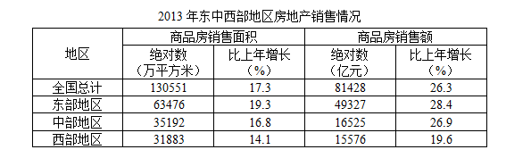 (一)2013年,全國(guó)商品房銷售面積130551萬(wàn)平方米,比上年增長(zhǎng)17.3%,增速比1-11月份回落3.5個(gè)百分點(diǎn),比2012年提高15.5個(gè)百分點(diǎn);其中,住宅銷售面積增長(zhǎng)17.5%,辦公樓銷售面積增長(zhǎng)27.9%,商業(yè)營(yíng)業(yè)用房銷售面積增長(zhǎng)9.1%。商品房銷售額81428億元,增長(zhǎng)26.3%,增速比1-11月份回落4.4個(gè)百分點(diǎn),比2012年提高16.3個(gè)百分點(diǎn);其中,住宅銷售額增長(zhǎng)26.6%,辦公樓銷售額增長(zhǎng)35.1%,商業(yè)營(yíng)業(yè)用房銷售額增長(zhǎng)18.3%。2013年末,全國(guó)商品房待售面積49295萬(wàn)平方米,比11月末增加2489萬(wàn)平方米,比2012年末增加12835萬(wàn)平方米。其中,住宅待售面積比11月末增加1696萬(wàn)平方米,辦公樓待售面積增加156萬(wàn)平方米,商業(yè)營(yíng)業(yè)用房待售面積增加346萬(wàn)平方米。
