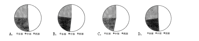 119.以下哪張統(tǒng)計(jì)圖準(zhǔn)確地表示了2013年?yáng)|部、中部和西部地區(qū)商品房銷售面積占當(dāng)年全國(guó)總銷售面積的比重?( )