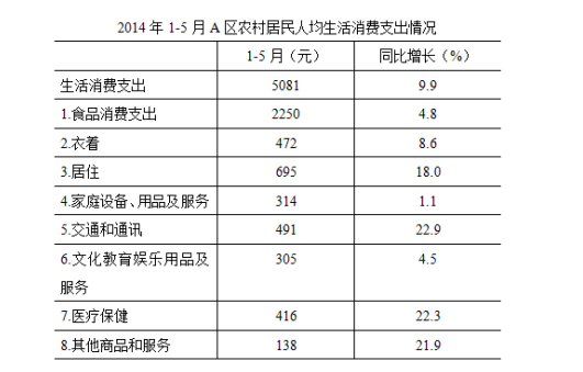 (三)抽樣調(diào)查數(shù)據(jù)顯示,2014年1-5月A區(qū)農(nóng)村居民人均現(xiàn)金收入9053元,同比增長(zhǎng)10.3%,增速較去年同期提高0.4個(gè)百分點(diǎn),其中人均工資性收入為5421元,同比增長(zhǎng)8.5%;人均家庭經(jīng)營(yíng)收入為760元,同比下降0.6%;人均財(cái)產(chǎn)性收入為1241元,同比增長(zhǎng)28.7%;人均轉(zhuǎn)移性收入為1631元,同比增長(zhǎng)10%。2014年1-5月A區(qū)農(nóng)村居民人均消費(fèi)性支出5081元,同比增長(zhǎng)9.9%,增速較去年同期下降1.7個(gè)百分點(diǎn)。
