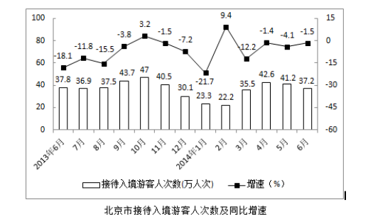2014年上半年,北京市接待旅游總?cè)藬?shù)1.16億人次,比上年同比增長(zhǎng)5.9%;實(shí)現(xiàn)旅游總收入1907.2億元,同比增長(zhǎng)8.2%。