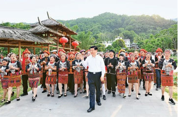 2022年4月10日至13日,中共中央總書記、國家主席、中央軍委主席習近平在海南考察。這是11日下午,習近平在五指山市水滿鄉(xiāng)毛納村向村民們揮手致意。新華社記者李學仁/攝