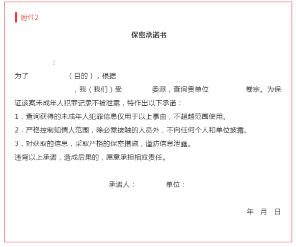 第十七條 對于許可查詢被封存的未成年人犯罪記錄的,應(yīng)當(dāng)告知查詢犯罪記錄的單位及相關(guān)人員嚴(yán)格按照查詢目的和使用范圍使用有關(guān)信息,嚴(yán)格遵守保密義務(wù),并要求其簽署保密承諾書。不按規(guī)定使用所查詢的犯罪記錄或者違反規(guī)定泄露相關(guān)信息,情節(jié)嚴(yán)重或者造成嚴(yán)重后果的,應(yīng)當(dāng)依法追究相關(guān)人員的責(zé)任。