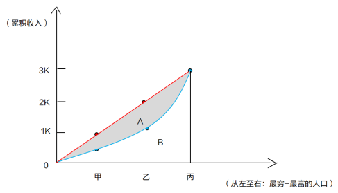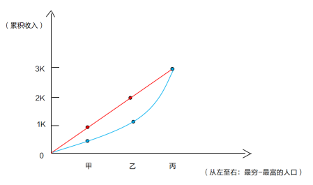 假設(shè)現(xiàn)在H國(guó)中僅有3個(gè)人,分別為甲乙丙,甲年收入為0.5K,乙年收入為0.8K,丙年收入為1.7K,按照之前的累積收入計(jì)算方式,甲對(duì)應(yīng)的累積收入0.5K,乙對(duì)應(yīng)的累積收入1.3K(乙對(duì)應(yīng)的累積收入=甲+乙),丙的累積收入3K,(丙對(duì)應(yīng)的累計(jì)收入=甲+乙+丙),將三點(diǎn)連成藍(lán)色的線,就有了情況二中H國(guó)的洛倫茲曲線。