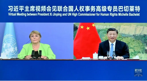 2022年5月25日,國(guó)家主席習(xí)近平在北京以視頻方式會(huì)見(jiàn)聯(lián)合國(guó)人權(quán)事務(wù)高級(jí)專員巴切萊特。新華社記者岳月偉攝