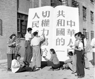 1954年9月20日,第一屆全國人大一次會議通過、頒布了《中華人民共和國憲法》,這是中國歷史上第一部社會主義憲法。圖為北京政法學院的同學們,以歡樂的心情趕制國慶節(jié)游行用的巨大模型,慶賀中華人民共和國憲法的誕生。新華社記者毛松友/攝