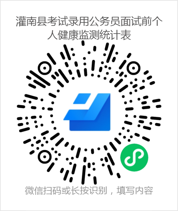 2. 從6月25日開始,每日填報(bào)一次《灌南縣考試錄用公務(wù)員面試前個(gè)人健康監(jiān)測(cè)統(tǒng)計(jì)表》(二維碼附后),連續(xù)填報(bào)14天,有條件的考生可提前到達(dá)我市備考,以防出現(xiàn)特殊情況導(dǎo)致不能按時(shí)到場(chǎng)參加考試。(建議將二維碼下載至手機(jī)保存,方便每天填報(bào))