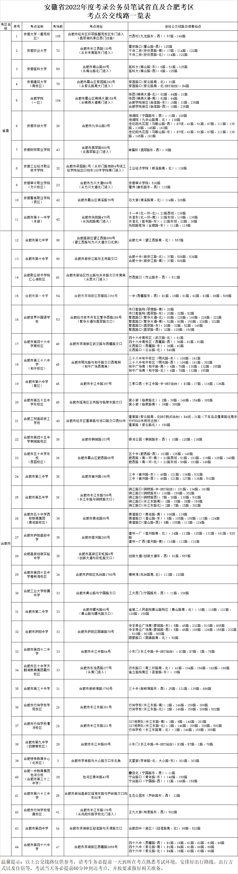 安徽省2022年度考錄公務員筆試省直及合肥考區(qū)考點公交線路一覽表