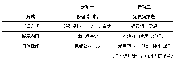 圍繞選項一與選項二進行對比,可發(fā)現(xiàn)選項一滿足:覆蓋面廣、群眾參與免費成本低等優(yōu)點,而博物館的展覽在參觀、體驗的門檻上要求相對較高,需要一定的戲曲基本知識;修建博物館成本更高;傳播集中于本地居民,而后逐步外移。