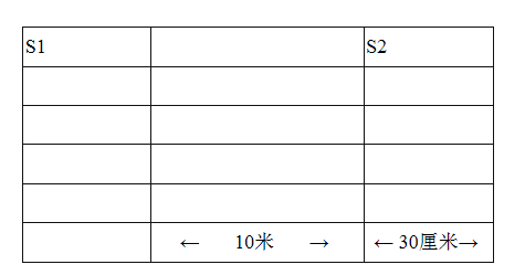 測試方法為:受測者用站立式起跑,聽到發(fā)令后從S1線外起跑,當跑到S2線前面,用一只手拿起一木塊隨即往回跑,跑到S1線前時交換木塊,再跑回S2交換另一木塊,最后持木塊沖出S1線,記錄跑完全程的時間。記錄以秒為單位,取一位小數(shù),第二位小數(shù)非“0”時則進1。測評次數(shù)不超過2次,考生有1次測評達標的視為該項目合格。